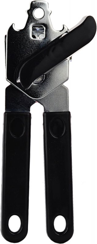 This black handle can opener comes with an easy to wind mechanism to quickly open metal cans. The tip of the can opener can also be used as a crown cap bottle opener.