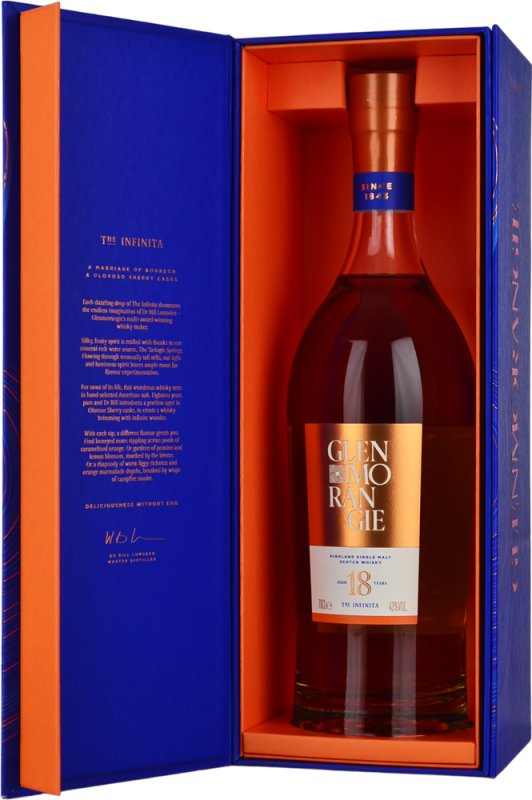 Glenmorangie 18 Year Old The Infinita encapsulates every element of the Glenmorangie house style in perfect harmony. Described by Dr Bill Lumsden, the director of whisky creation at Glenmorangie as being their "most deliciously complex creation." It spans a kaleidoscope of tastes and aromas. With each sip, a different flavour awaits. There's honeyed notes rippling across waves of caramelised orange. But on another sip, you get gardens of jasmine and lemon blossom, touched by a gentle breeze. A further taste gives a sensation of a mix of warm figgy richness and depths of orange marmalade, brushed by touches of campfire smoke. With multi-layers of deliciousness to unveil, this 18 Year Old expression provides a highly memorable tasting experience. Each drop is filled with much wonder and delight.